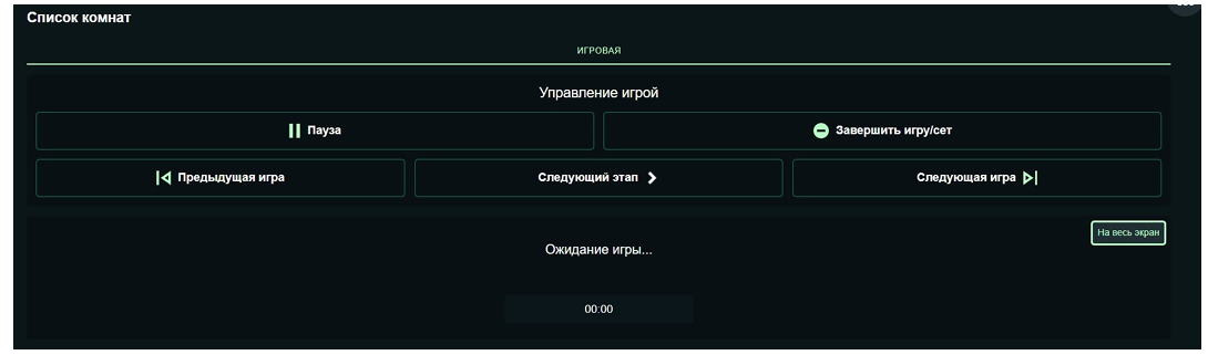 Меню управления полем можно открыть, нажав на кнопку «Управление полем» в нижней части интерфейса. Данный интерфейс состоит из нескольких блоков. В верхней части экрана расположен блок управления игрой. В данном блоке можно временно приостановить или продолжить игру, полностью закончить воспроизведение игр, переключиться на прошлую или следующую игру в данном сете и переключиться на следующий этап текущей игры (рисунок 19).