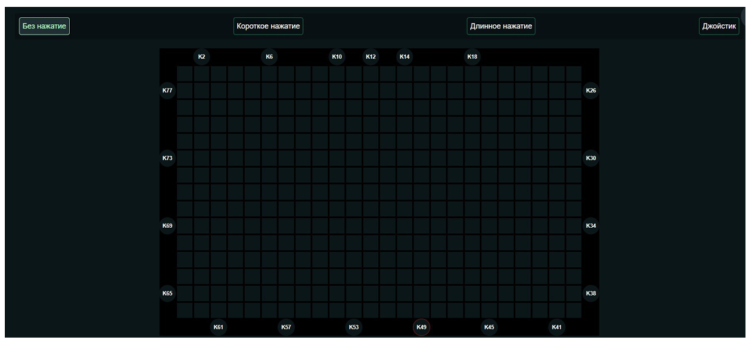 Ниже располагается блок управления полем. На нем изображена схема игровой комнаты, на котором в реальном времени отображается все, что в данный момент отображается в самой комнате, в частности цвета и состояния пикселей пола и настенных кнопок (рисунок 20). Если из кнопок, расположенных выше схемы поля, выбрана «Без нажатие», то нажатие на любой пиксель или кнопку схемы поля выведет меню с информацией о данном элементе. Режим «Короткое нажатие» позволяет создать сигнал, аналогичный кратковременному нажатию на любом пикселе или кнопке комнаты. Режим «Длинное нажатие» создает постоянный сигнал на выбранном пикселе или кнопке – данный элемент будет считаться постоянно нажатым пока его состояние не будет изменено.