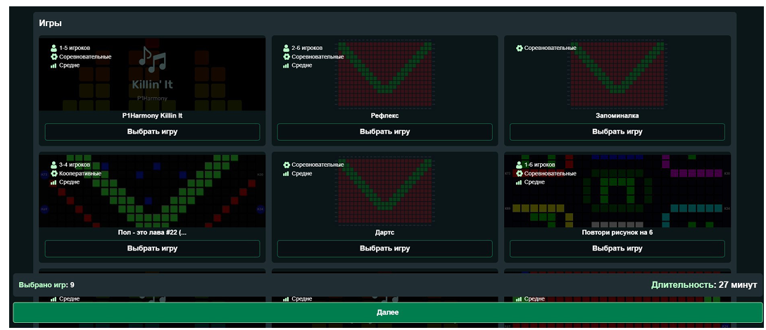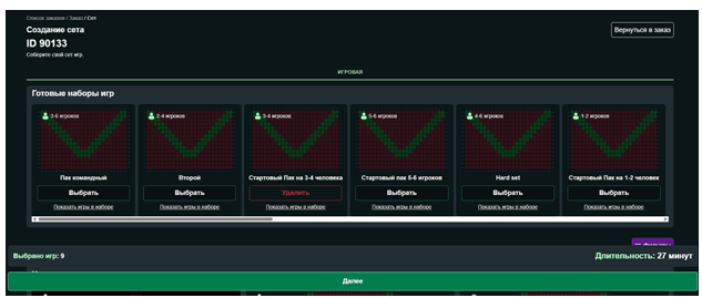 После выбора всех необходимых игры и нажатия кнопки «Далее» открывается список выбранных игр. Здесь представлены все игры которые были выбраны на предыдущем этапе, как из наборов так и вручную (рисунок 16).