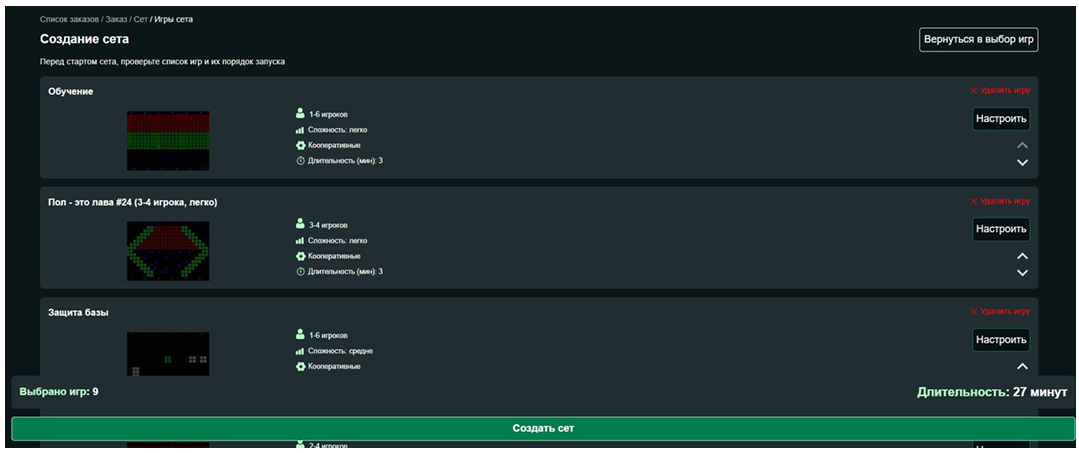 Помимо использования готовых наборов, игры в сете можно выбрать вручную из списка игр, представленного в блоке «Игры». Для каждой игры помимо названия представлена небольшая сводка с типом игры, ее сложностью и количеством игроков. Для добавления игры в сет необходимо нажать «Выбрать игру». Добавлять в сет можно несколько игр из данного списка (рисунок 15).