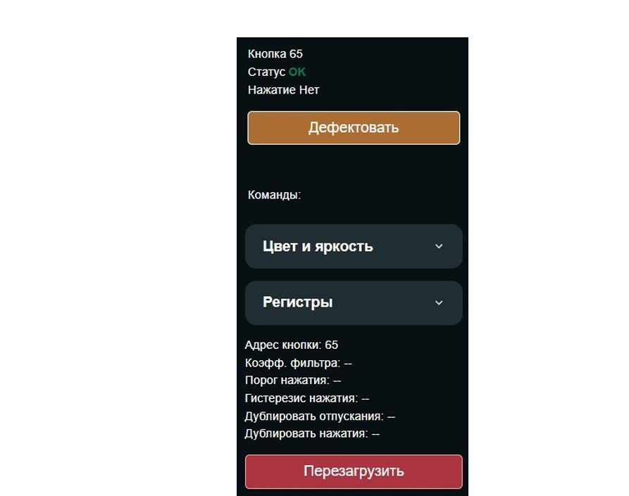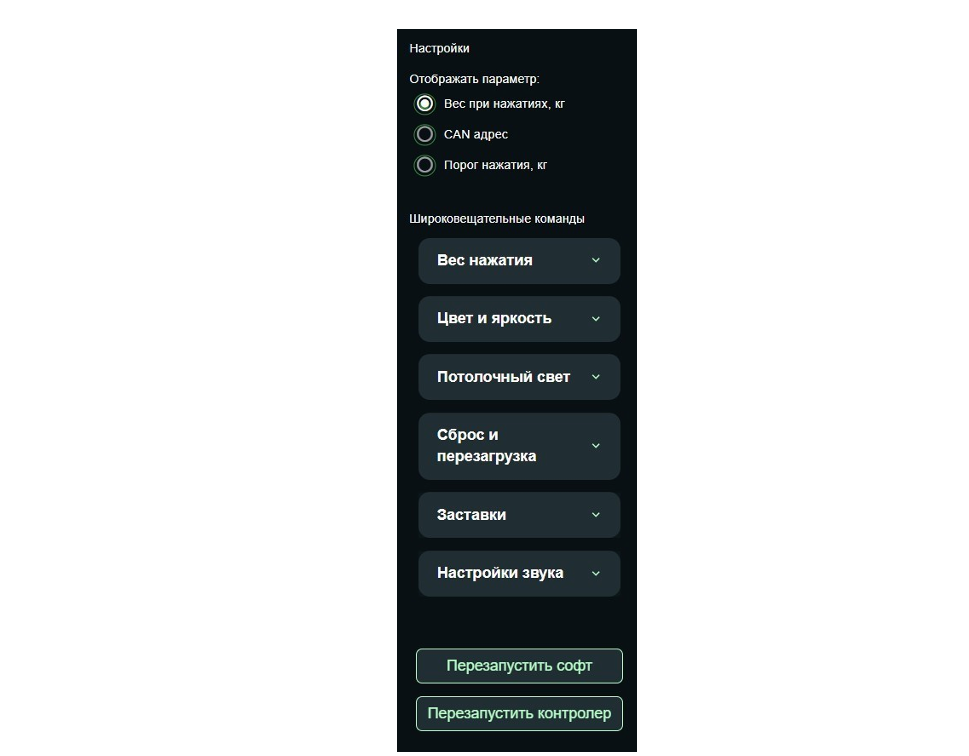 Меню «Сброс и перезагрузка» позволяет произвести сброс выставленного веса нажатия для всех пикселей с помощью кнопки «Сбросить вес», или произвести полный аппаратный перезапуск пикселей с помощью кнопки «Перезагрузить».