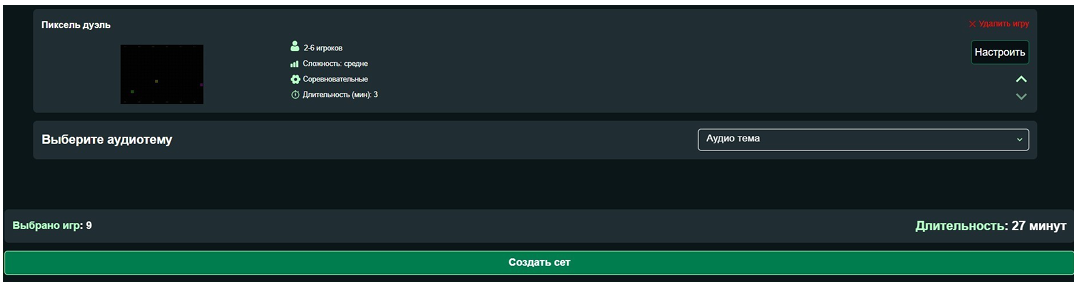 Меню настройки сета выполняет ряд основных функций: выбор заготовленных заранее наборов игр, ручной выбор и настройка параметров отдельных игр, выбор музыкальной темы. Первая опция при настройке сета это блок «Готовые наборы игр» (рисунок 14). Данный блок предоставляет ряд наборов игр с заранее заданными настройками. Нажатие кнопки «Показать игры в наборе» позволит увидеть информацию об играх в данном наборе, такую как название игры, количество игроков, тип игры, сложность и длительность. Кнопка «Выбрать» добавляет игры данного набора в список редактируемого сета.