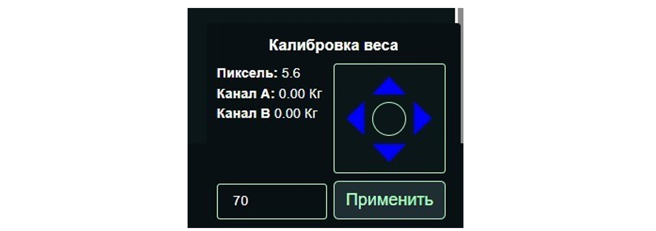 Меню «Калибровка веса» позволяет задать калибровочное значение пикселя. Данное значение вычитается из значения датчика веса для правильного получения и обработки информации о нажатии. В пустую графу вводится значение веса в килограммах и затем кнопкой «Калибровка веса» запускается процесс калибровки с заданным параметром.
