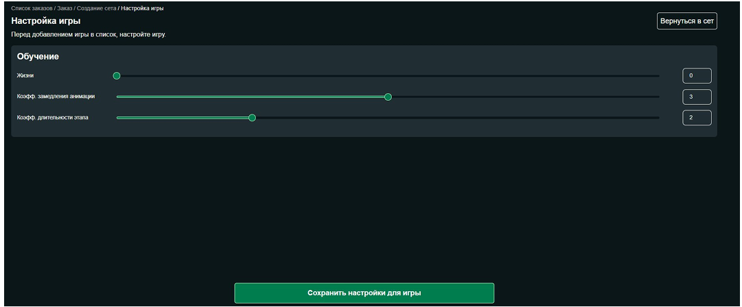 Нажав кнопку «Удалить игру» около соответствующей игры можно удалить игру из списка. Если необходимо вернуть убранную из списка игру или добавить новые, следует нажать кнопку «Вернуться в выбор игр» для возвращения на предыдущий этап создания сета. Кнопки вертикальных стрелок позволяют перемещать в списке: таким образом можно изменить порядок, в котором игры будут выбраны во время мероприятия. Кнопка «Настроить» открывает меню настройки соответствующей игры, в котором можно изменить параметры данной игры (рисунок 17).