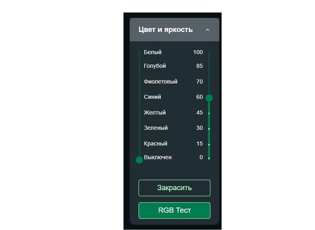Меню «Цвет и яркость» позволяет задать определенный цвет всем пикселям и кнопкам комнаты, а также потолочному свету и вывеске (рисунок 23). С помощью слайдеров выбирается цвет и яркость, и затем кнопкой «Закрасить» передается нужный цвет. Кнопка «RGB тест» запускает чередование из красного, зеленого и синего цвета для проверки работоспособности оборудования.