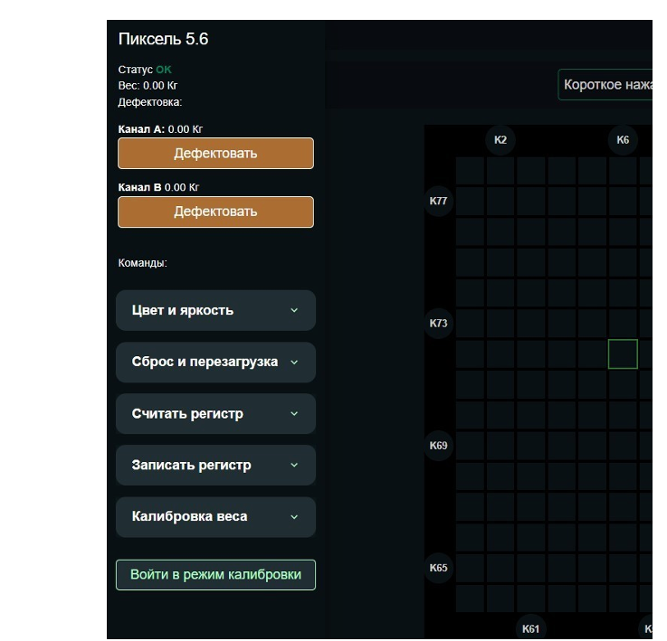 Графа «Статус» показывает текущее состояние подключения пикселя. Графа «Вес» показывает текущее значение на датчиках веса данного пикселя.
